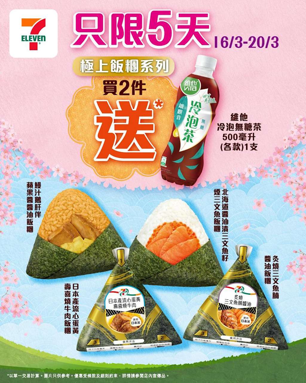 返工返學想食得輕盈啲?由即日起到星期五(2026 年 3 月 20 日),嚟 7-Eleven 買 2 件 7-SELECT 極上飯糰,我哋即刻請你飲 維他冷泡無糖茶 (500毫升)!一口細膩米香,一口清爽茶回甘,絕對係最正嘅 Spring Combo!快啲嚟補吓機啦!